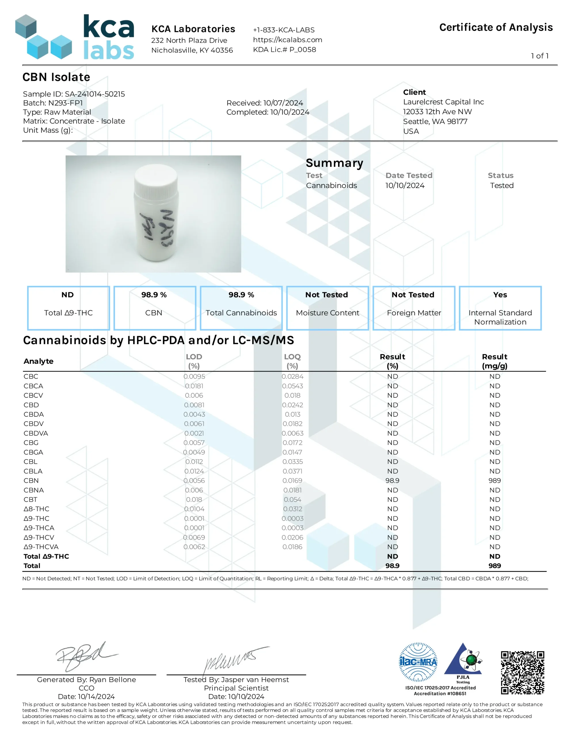 THC非検出(1ppm以下)を確認済みの、高純度98%以上のCBNアイソレート原料です。GMP取得・FDA認証済みラボと連携し、ISO/IEC17025認証検査機関より発行された分析証明書(COA)付きで安心してご利用いただけます。